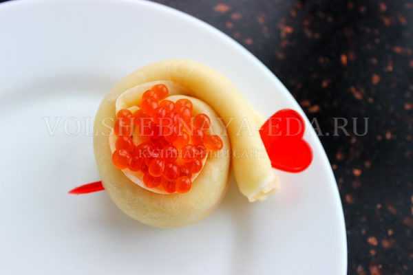 Какой бы из способов вы ни выбрали, сверху закуску можно украсить дополнительной порцией красной икры и сметаной, тогда блюдо будет смотреться в тарелке эффектнее. Сметану можно нанести с помощью кондитерского мешка с насадкой «звезда».