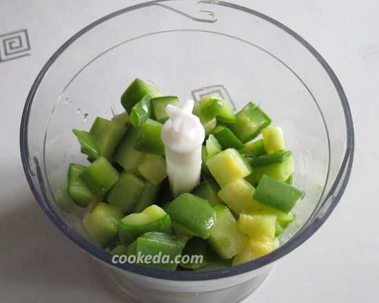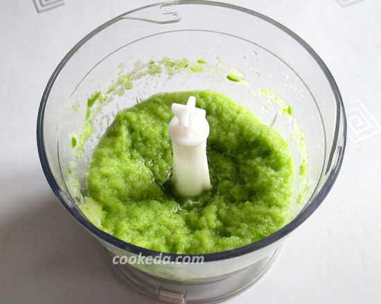 - Патиссоны и кабачки измельчить до состояния пюре любым удобным способом – блендер, комбайн, мясорубка.