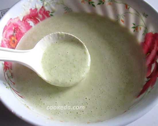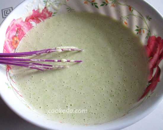- Не прекращая замес теста, добавляйте к нему пшеничную муку порционно, по одной ложке. Ваше тесто для блинов должно не содержать комочков муки и иметь текстуру крема. Если тесто получилось жидкое (лишний сок кабачка или большие яйца), то досыпьте муки еще немного.