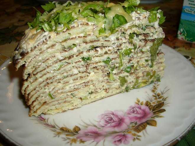 - Оставшимся блинчиком накрыть все, обмазать получившийся торт майонезом сверху и по бокам, посыпать рубленной зеленью.