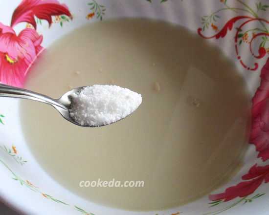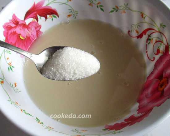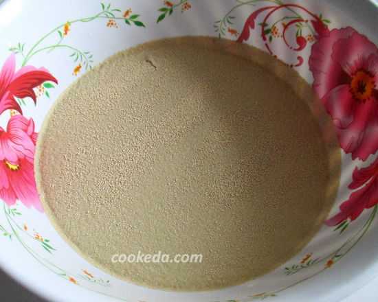 В глубокую и вместительную посуду налейте подогретую до 30—34° воду. Высыпьте из пакетика сухие дрожжи.