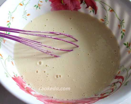 Далее замешиваем тесто из молока и просеянной муки, делаем его чуть гуще, чем для обычных блинов.