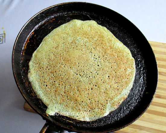 Сковороду смажьте маслом (единожды). Поставьте на умеренный огонь и хорошо разогрейте. Налейте на середину порцию теста. Наклоняя сковороду, быстро сформируйте круг. Поверхность теста вскоре начнёт пузыриться, образуется много дырочек.