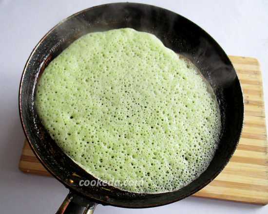 - На разогретую сковороду очень тонким слоем налить тесто, подождать пару минут, пока оно «схватится», чтобы начинка не порвала его.