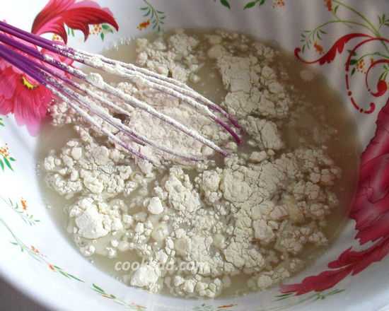 Введите муку, добавляя её небольшими порциями, одновременно перемешивая её с водой с помощью венчика.