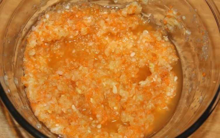 - Через кусочек марли отожмите лишний сок, иначе тесто будет жидкое.
