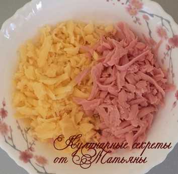 2. Теперь займемся собственно припеком. Сыр натираем на терке. Меленько нарезаем колбасу.