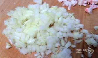 - репчатый лук измельчаем и спассеруем до легкой золотистости, солим, добавляем специи