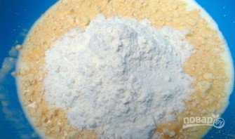 3. Муку смешать с содой и постепенно, сначала один стакан, а затем и второй, смешиваем с яично-кефирной смесью, старательно перемешиваем, чтобы избежать комочки.