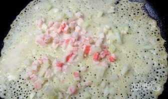 Раскалите на плите сковороду для блинов, смажьте ее растительным маслом. Затем вылейте на нее тесто, посыпьте крабовыми палочками с луком и слегка прижмите начинку лопаткой.