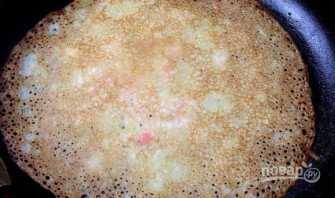 На среднем огне печем блинчик пару минут, пока он не зарумянится снизу. Теперь переворачиваем на сторону с начинкой и жарим, не меняя мощности, еще пару минут. Крышкой, при этом, накрывать не нужно