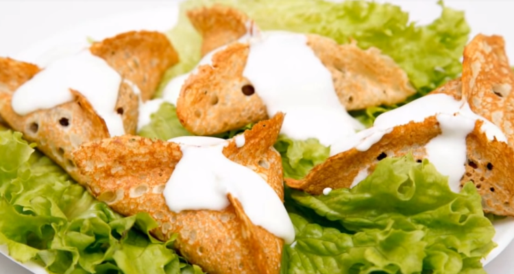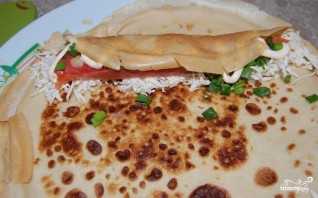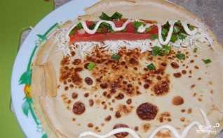 Чтобы сделать этот вид закуски, стоит испечь блины. Можете взять рецепт, который больше вам по душе. Главное, чтобы блины были нежные, несладкие, ведь мы используем соленую начинку.