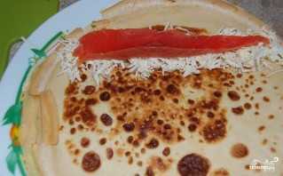 Начинаем выпекать блины. После того, как блинчики готовы, приступаем к их фаршированию творожно-рыбной начинкой. На блин наносим 2 ст.л. творожного сыра равномерно по всей поверхности. На край блина кладём нарезанную брусочками красную рыбу и плотно заворачиваем.