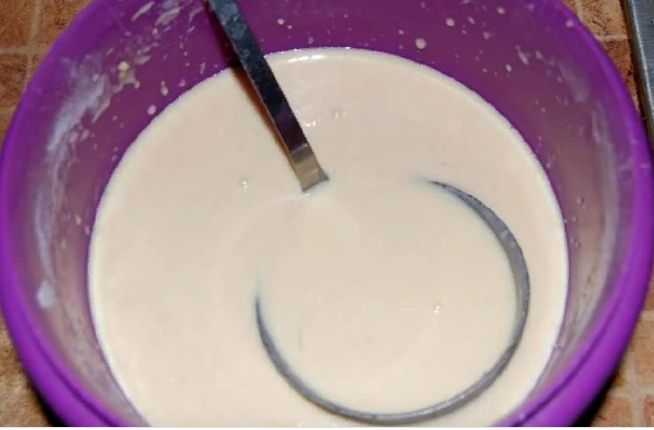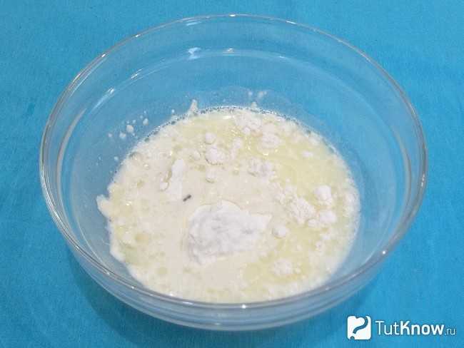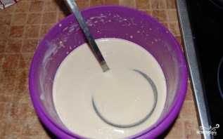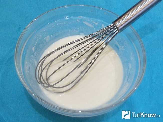- Добавляем к желткам сметану, соль и сахар. Растираем яичную массу с помощью вилки или миксера, постепенно добавляя молоко и растопленное сливочное масло.