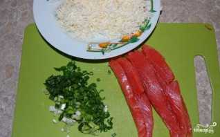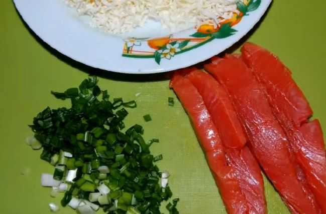 3. После того, как все готово, приступаем к начинке. Натираем сыр на терке, режем семгу длинными пластами и крошим зелень.