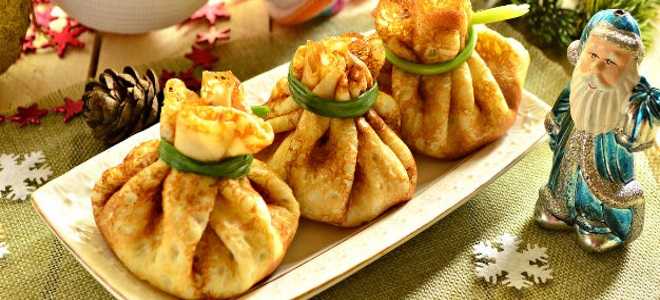 Для этого выкладываем начинку на середину блина, а потом поднимаем и связываем края.