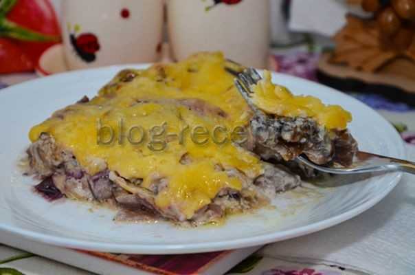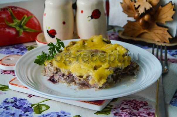 Готовое блюдо на противне нарезаем ножом или деревянной лопаткой на квадраты по количеству порций, аккуратно перекладываем на тарелки и подаем к столу.