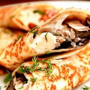 Главное в фаршированных блинах – это начинка, на которой концентрируется основное внимание, поэтому сам блин должен иметь нейтральный, чуть пресноватый вкус. Поэтому сами блины предпочтительнее жарить на молоке или воде.