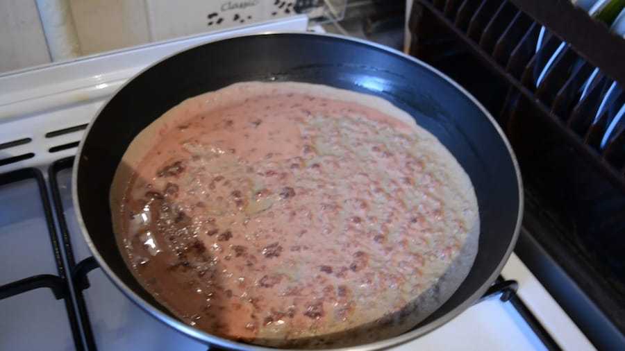 6. Нагреваем сковороду, смазанную маслом. Когда она хорошенько раскалится, отправляем сюда первую порцию теста. Поворотом ручки, распределяем его по всей окружности. Много не лейте – чем меньше теста, тем тоньше изделие. Жарим с двух сторон на огне выше среднего, до румяности.