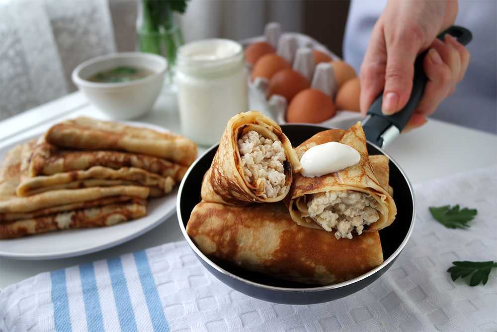Рецептура блинчиков с начинкой из куриного фарша и грибов