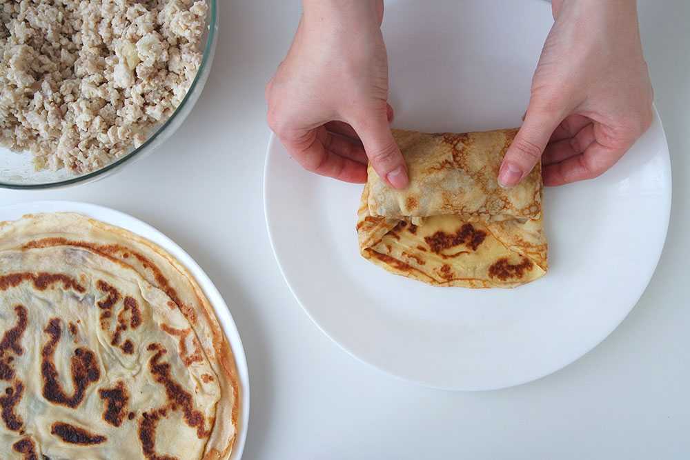 Также можно просто положить на центр начинку, сложить блин вдвое и полить соусом: просто, но не нужно тратить время на длительную фаршировку. Еще один из простых вариантов – это размазать начинку по плоскости блина и свернуть рулетиком. Эти простые варианты подразумевают процесс без обжаривания — сразу подачу к столу тонких блинчиков с фаршем.