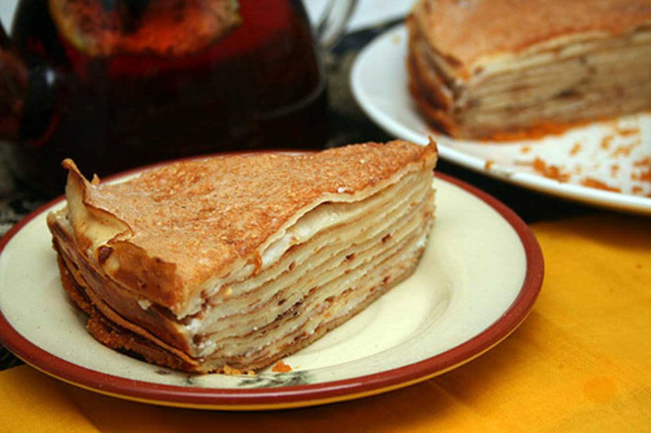 - Накройте торт вторым слоем и повторяйте процедуру, пока блины на столе не закончатся.