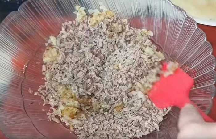 Для формирования начинки можно использовать мясорубку или блендер. На средней скорости прокручивается печень до однородной массы и потом добавляются яйца.