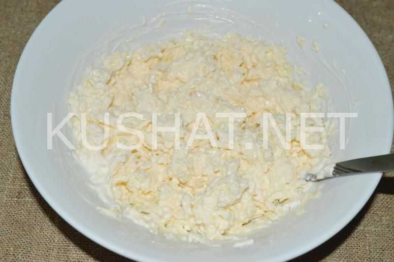 Если вы по каким-то причинам его не употребляете, замените его несладким йогуртом или сметаной. Сырковую массу по желанию можно немного поперчить, а также добавить в нее любую свежую зелень. Начинку перемешайте.