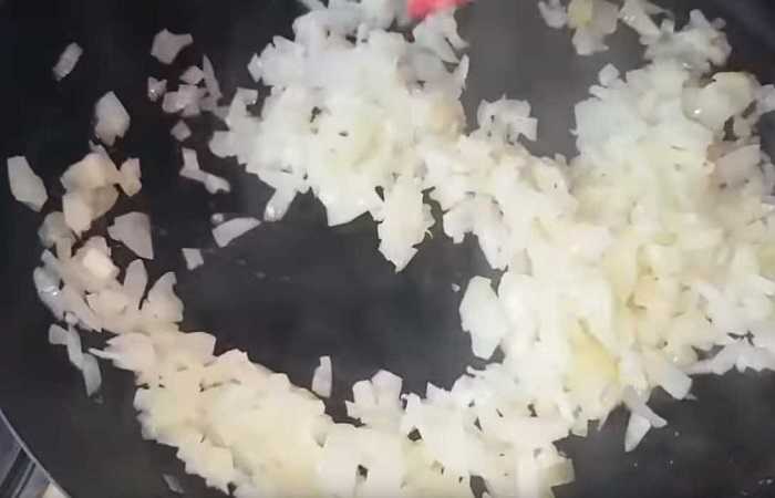 - Нагреть масло в сковороде и обжарить лучок до легкой золотистости.