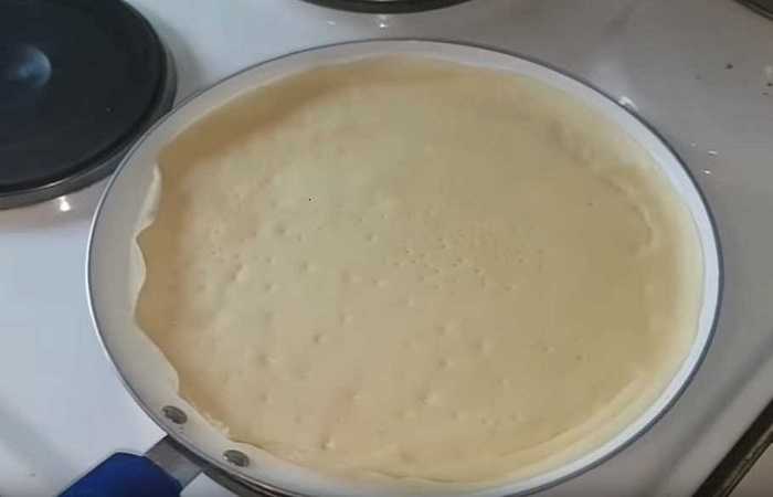 Варианты теста вы можете посмотреть в статье «Как приготовить блины». Если начинка не сладкая, то и в тесто насыпьте меньше сахарного песка.