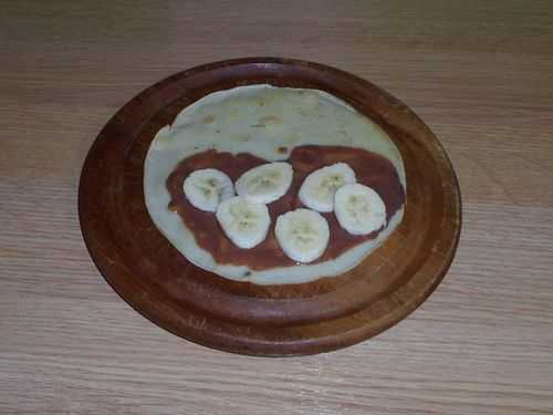 - Сделать изысканные блины с бананами, рецепт с фото которых поможет не допустить ошибок в приготовлении, очень просто. На изделие выкладываем часть банановой начинки, приблизительно 35-40 грамм.