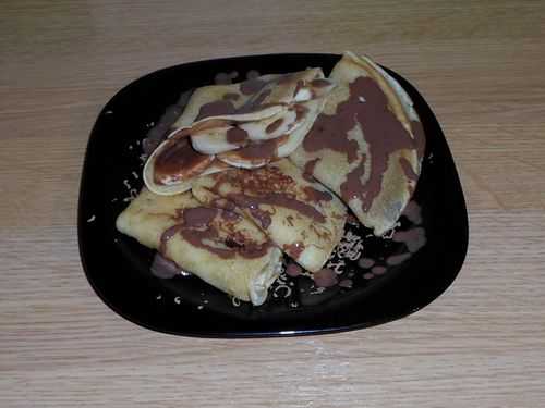 Претворяя в жизнь рецепт блинчиков с шоколадом, можно воспользоваться пустыми пластиковыми бутылками из-под молока, йогурта или минералки. Для чего это нужно? Для занятия творчеством! В бутылки заливается светлое и темное тесто, в крышке каждой бутылки проделывается по одному отверстию — и «карандаши» для рисования тестом на сковороде готовы! Можно рисовать рожицы, цветочки, орнаменты, абстрактные разводы — всё, что захочется! Дети от таких блинчиков будут в восторге! Можно делать и кружевные блинчики, с дырочками, но для данного рецепта этот вариант не подходит. Здесь нужны плотные сплошные блинчики.
