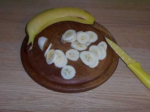 - Отставляем миску в сторону на 10 минут, чтобы тесто «созрело». Бананы промываем, освобождаем от кожуры, режем в меру тонкими кружками. Получится около 400 грамм начинки.