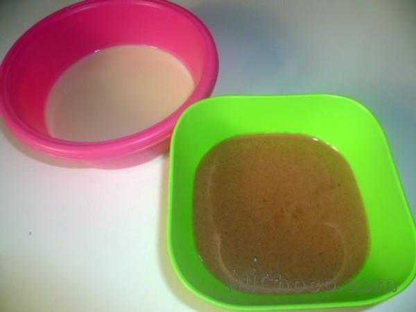 Разделить готовое тесто на две части, равные по объему. В одну из частей добавить порошок какао и перемешать. Для того чтобы блинчики лучше выпекались и не прилипали к сковороде, есть маленькая хитрость: блинчики из полностью готового теста выпекать не сразу после того, как тесто сделано, а через полчасика. Пусть оно постоит, а за это время можно, например, подготовить бананы для начинки.