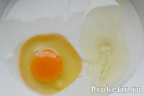 В миску вылейте кефир, добавьте к нему все жидкие ингредиенты из рецепта – яйцо, растительное масло, и соедините все ингредиенты в однородную жидкую массу. Это можно сделать как кулинарным венчиком, так и с помощью кухонной техники – блендера или комбайна.
