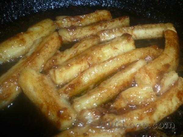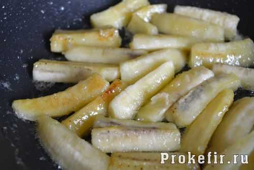 На сковороде растопить сливочное масло, добавить туда сахар (обыкновенный и ванильный), перемешать. Затем добавить порезанные бананы и обжарить их на медленном огне минуты 3-4. Выключить газ, добавить корицу