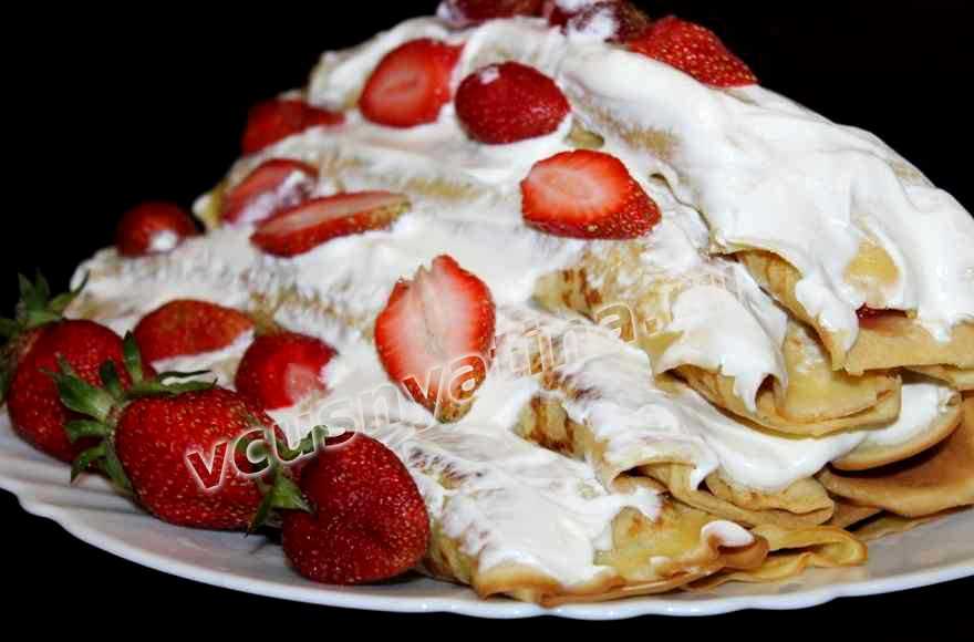 Итак, на тарелку для подачи торта уложите блинчики с клубникой, и первый ряд смажьте сметаной или сливками.