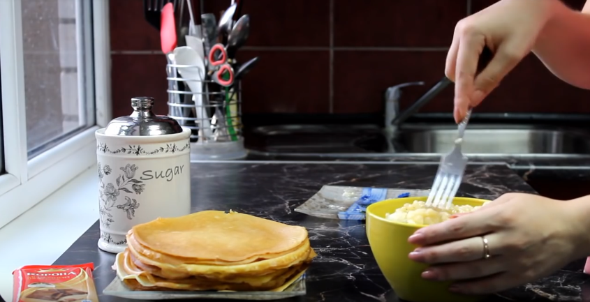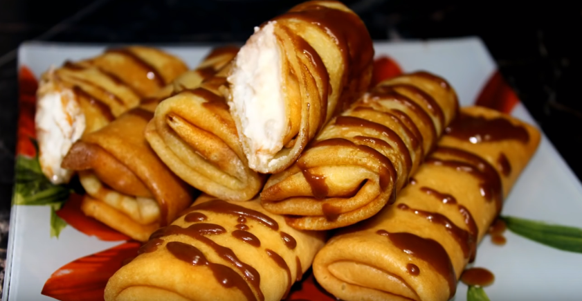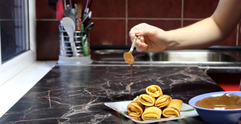 - Смазывайте блинчики начинкой и сворачивайте трубочкой.