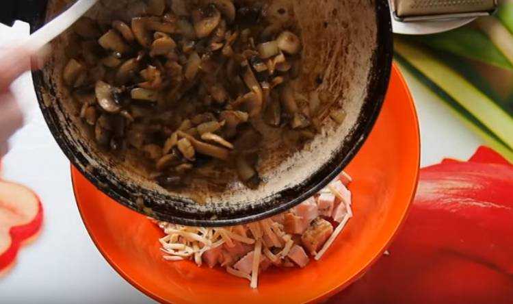 Теперь готовим начинку. Для этого сыр трем на крупную терку, ветчину нарезаем кубиками. Лук нужно нарезать кубиками и обжарить на сливочном масле до золотистого цвета. Выкладываем грибочки и обжариваем, я использую шампиньоны.