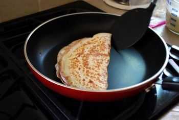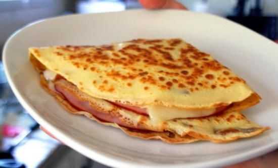 Как положите ветчину, сразу сложите блин на пополам, накрыв незаполненной половинкой блина ту половинку, на которой есть сыр и ветчина.Затем сложите блин еще раз на пополам. Получится треугольничек. Снимите готовый блин с яйцом и ветчиной со сковороды и начните готовить следующий.Из данного количества теста получается 6 больших блинов или 8 средних.