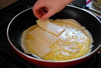 Дайте яйцу чуть запечься, положите сверху несколько ломтиков сыра. Но кладите сыр не на всю площадь, а только на половинку блина. Дайте сыру немного расплавиться, буквально 30-60 секунд, зависит от вашего сыра. Кстати, лучше берите тот, что легко плавится и не становится резиновым.
