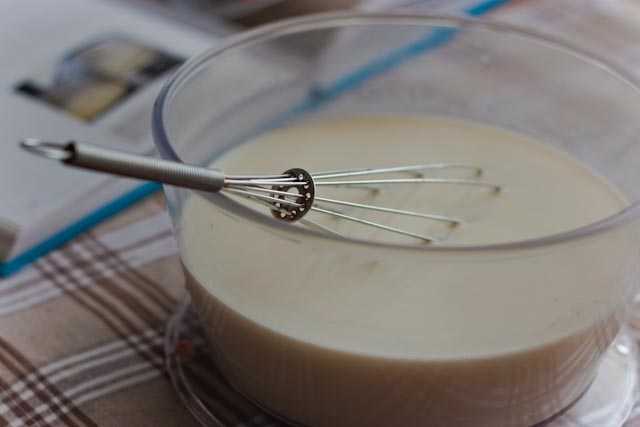 Постепенно вливайте молоко комнатной температуры, не переставая при этом взбивать. Можно использовать продукт с любым процентом жирности. Если у вас немного не хватает молока, разведите его теплой, кипяченой водой.