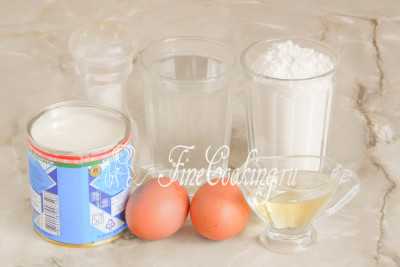 В рецепт этих тонких, сладких и вкусных блинчиков входят следующие ингредиенты: вода (кипяток), банка (380 граммов) сгущенного молока, куриные яйца среднего размера (45-50 граммов каждое), пшеничная мука (высшего сорта), растительное (я использую подсолнечное) масло без запаха, а также щепотка соли для баланса вкуса.