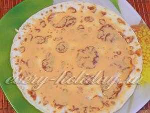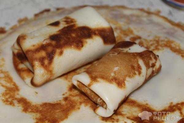 - Когда все блинчики пожарятся и остынут, кладем на каждый ложку начинки. Разравниваем по поверхности, оставляя пустыми края, и сворачиваем рулетиком. Если начинка получилась густоватой, просто кладем ее на середину и сворачиваем конвертиком.