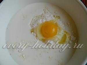 - Соединить молоко и яичную массу. Всыпать в смесь соду и понемногу добавлять муку, постоянно перемешивая лопаткой тесто.