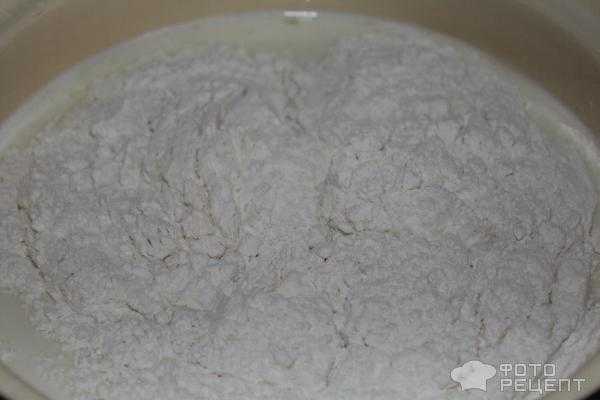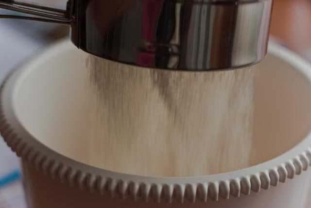 Начинаем малыми порциями добавлять в тесто смесь муки и разрыхлителя.
