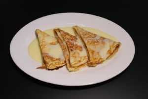 — мука – 2 стакана; — молоко – 2 стакана; — яйцо куриное – 1 шт.; — подсолнечное масло – 3 ст. ложки; — вода теплая – 1/2 стакана; — соль – 1/3 чайной ложки; — Для начинки: — масло сливочное – 1/2 (пачки 100 гр.); — вареная сгущенка – 1/2 банки.