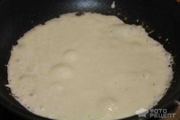Затем 2/3 половника теста заливаем в сковородку и распределяем ровным слоем по поверхности. - Когда блинчик полностью пропечется в течение минуты, переворачиваем его на другую сторону и обжариваем еще столько же.