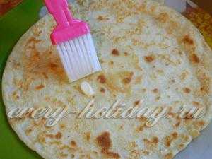 - Сняв готовый блин с огня, промазываем его сливочным маслом с обеих сторон.