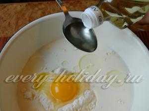 - Когда основа теста будет готова, всыпаем в него соду и заливаем подсолнечное масло, после чего снова все тщательно перемешиваем, чтобы все ингредиенты, а главное сода, разошлись по тесту.